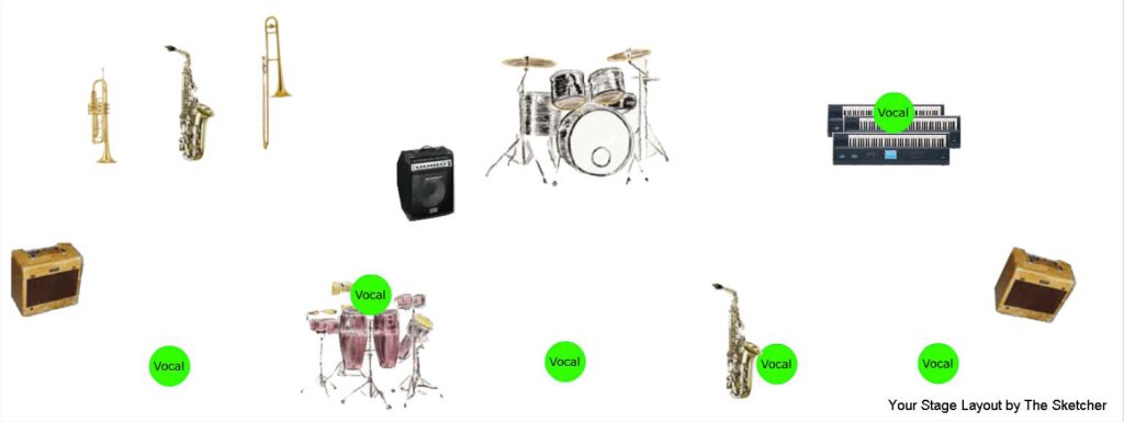 Horns up stage right 1 - 2 wedges horn section has own clip on mics